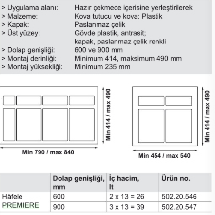 HÄFELE PREMIERE Çekmece İçi Çöp Kutusu 2x13 Lt | 600 mm Kapak Genişliği